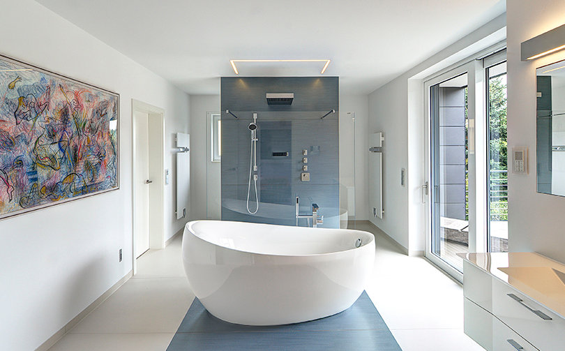 Entstanden ist eine schlichte Eleganz im großzügigen Ambiente und freistehende Wannenlösung. Die Gestaltung wird durch individuell angefertigte Waschtischplatten, vertikale und horizontale Lichtschlitze abgerundet.